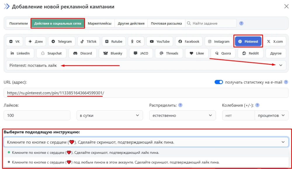 Введите ссылку на пин/аккаунт, количество лайков в нужный период, выберете подходящую инструкцию и нажмите кнопку «Сохранить». О том, как настроить другие параметры рекламной кампании, рассказываем здесь.