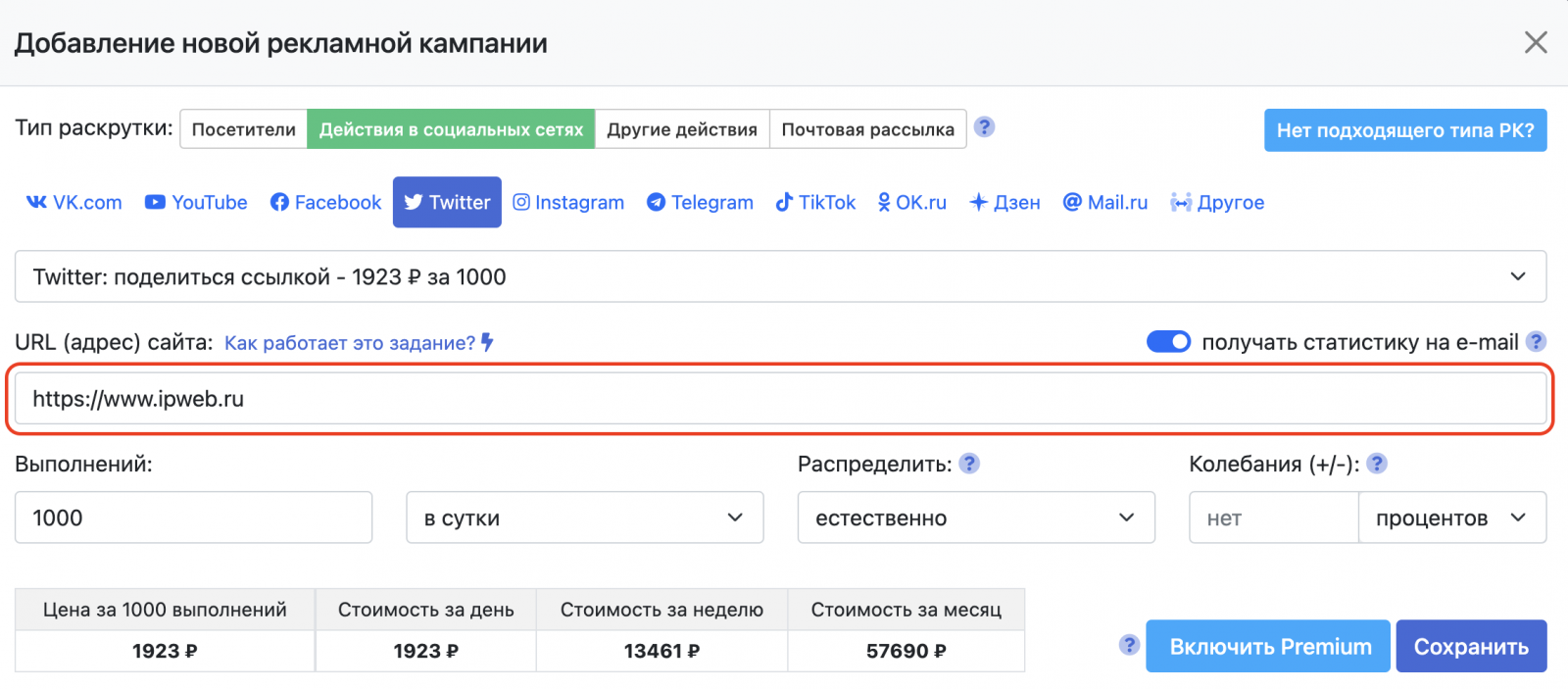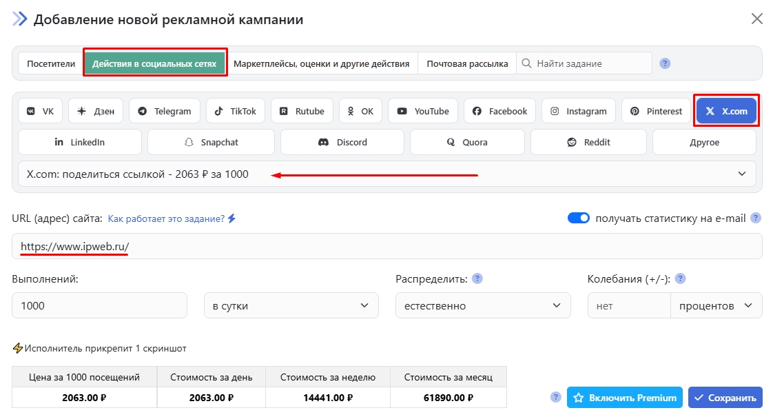 Зайдите в свой аккаунт на IPweb. В меню слева кликните «Продвижение» — «Мои кампании» — «Добавить рекламную кампанию» — «Действия в социальных сетях» — «X.com» — «X.com: поделиться ссылкой».