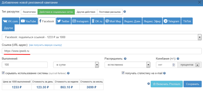 Зайдите в свой аккаунт на IPweb. В меню слева кликните «Продвижение» — «Мои кампании» — «Добавить рекламную кампанию» — «Действия в социальных сетях» — «Facebook» — «Facebook: поделиться ссылкой».
