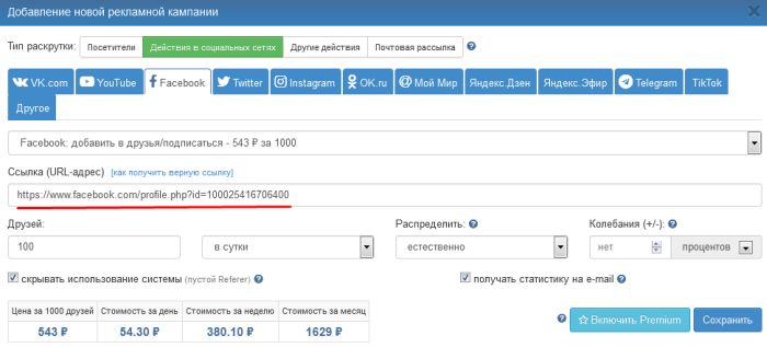 Введите ссылку на страницу в Facebook и количество друзей в сутки.