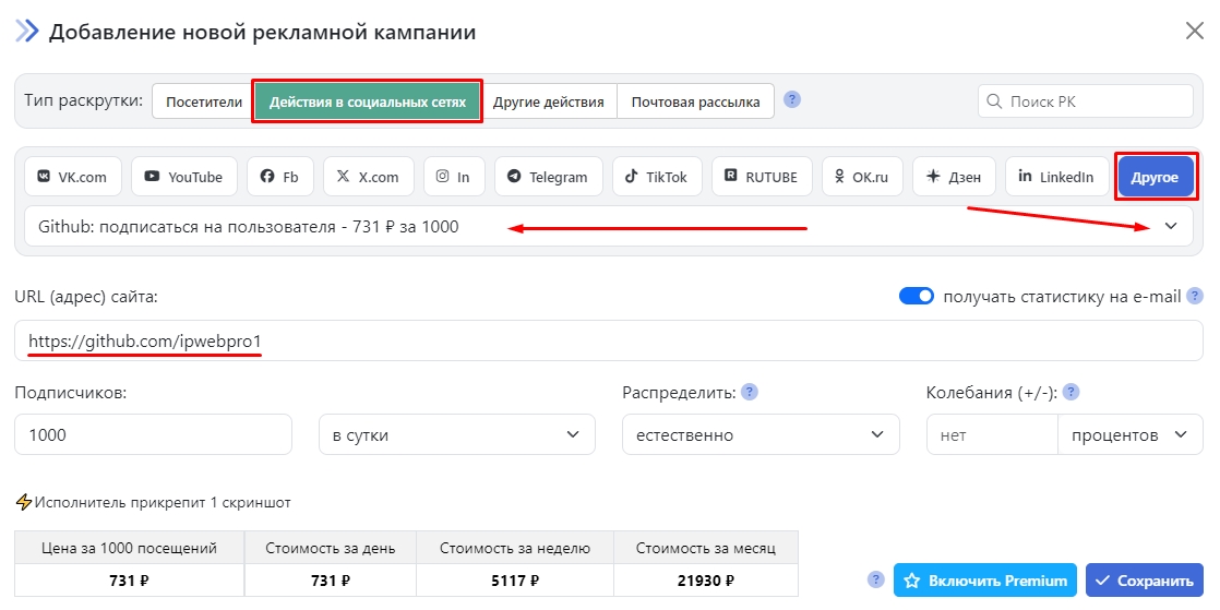 Зайдите в свой аккаунт на IPweb. В меню слева кликните «Продвижение» — «Мои кампании» — «Добавить рекламную кампанию» — «Действия в социальных сетях» — «Другое» — «Github: подписаться на пользователя».