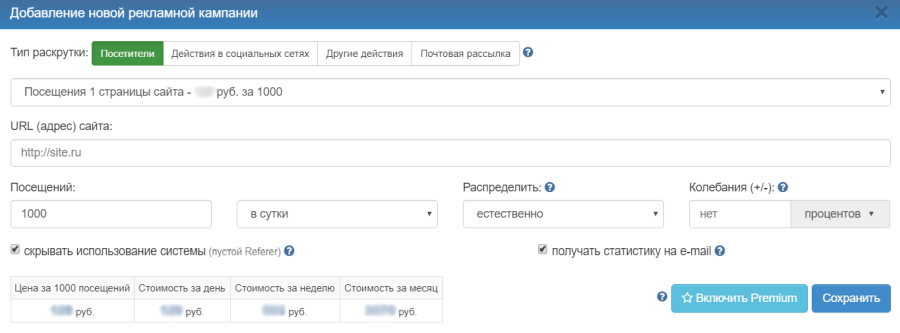 Далее выберите в пункте "Типы раскрутки" – "Посещения 1 страницы сайта" и заполните необходимые поля: