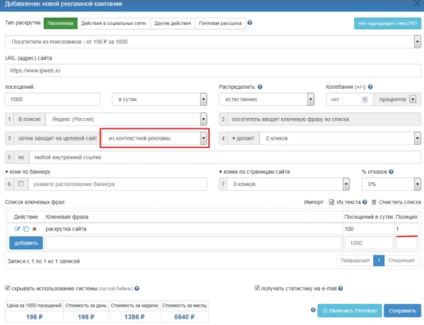 В "Тип раскрутки" выберите "Посетители из поисковиков" и заполните необходимые поля: