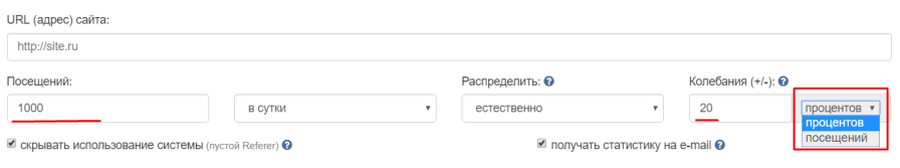 Колебания (+/-) – случайное отклонение количества посещений в большую или меньшую сторону. Например, для 100 посещений в сутки и 5% колебаний, суточное распределение трафика будет в количестве от 95 до 105 посещений: Пн – 97, Вт – 103, Ср – 100 и т. д.