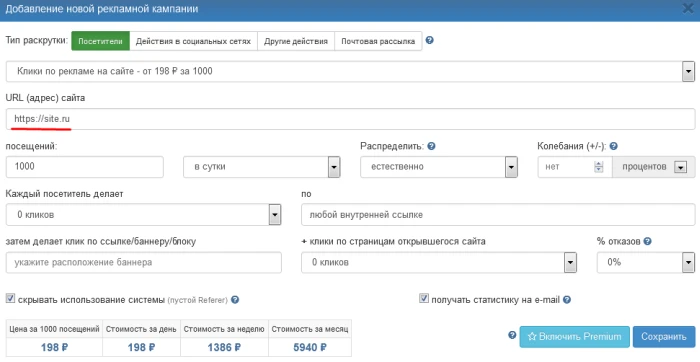 Далее в пункте «Тип раскрутки» выберите «Клики по рекламе на сайте» и заполните необходимые поля: