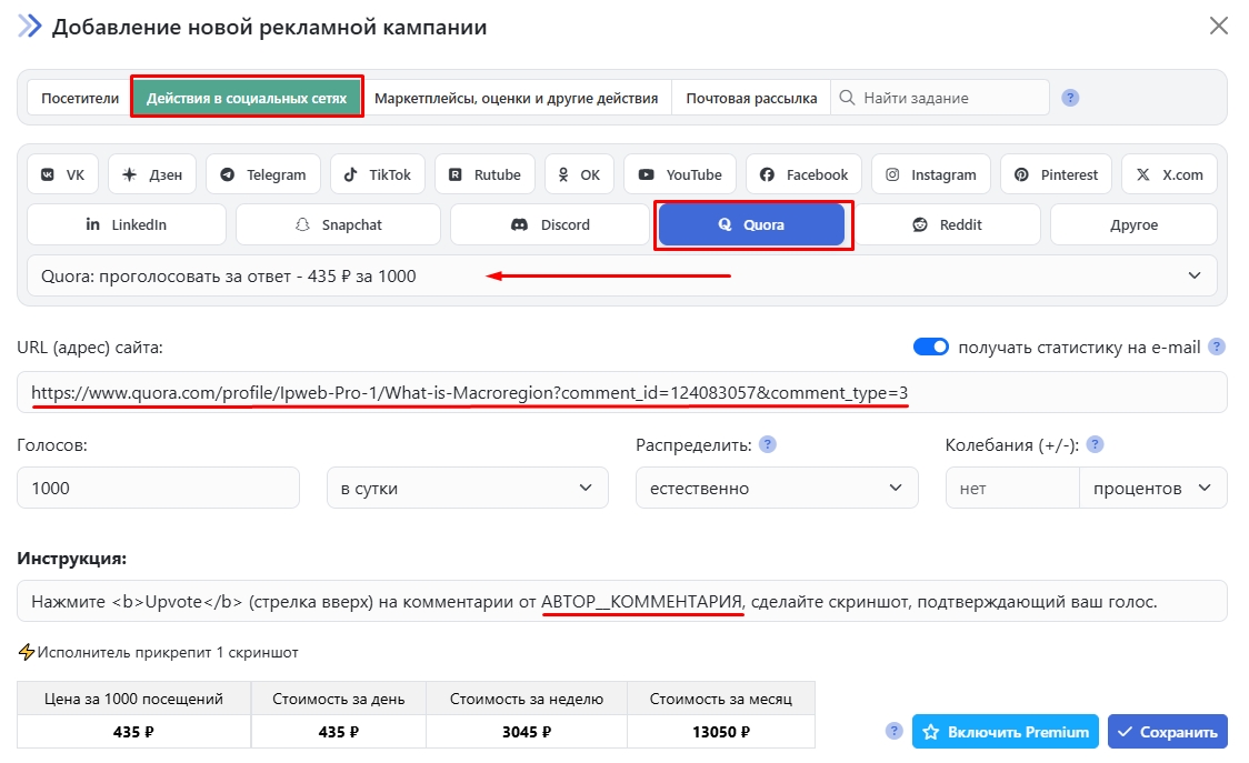 В рамках этой рекламной кампании можно заказать голоса на комментарии (ответы) под постами и вопросами на платформе Quora.