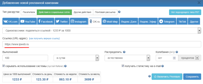 Зайдите в свой аккаунт на IPweb. В меню слева кликните «Продвижение» — «Мои кампании» — «Добавить рекламную кампанию» — «Действия в социальных сетях» — «OK» — «Одноклассники: поделиться ссылкой».