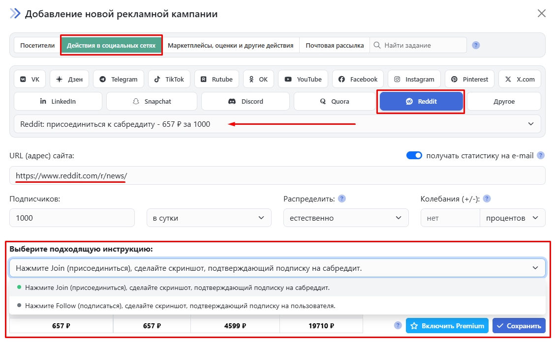 Введите ссылку на страницу сабреддита или профиля, количество подписчиков в нужный период, выберите подходящую инструкцию из выпадающего списка и нажмите кнопку «Сохранить». Кампания сразу отправится на модерацию и будет запущена после прохождения проверки.