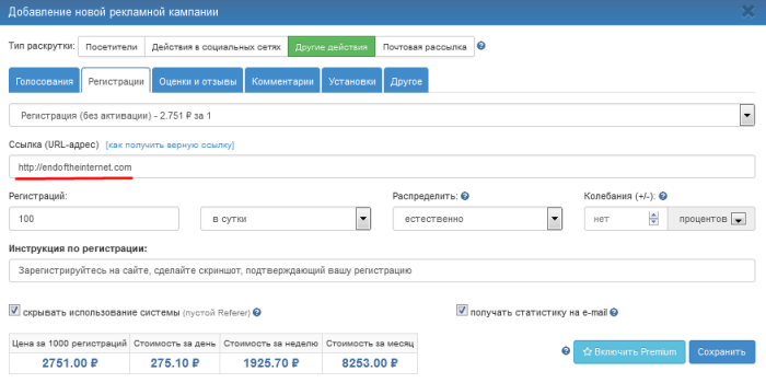 Данный тип рекламной кампании позволяет заказать регистрации на любых ресурсах без подтверждения по e-mail. Например, зарегистрироваться по реферальной ссылке.