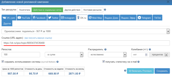 Зайдите в свой аккаунт на IPweb. В меню слева кликните «Продвижение» — «Мои кампании» — «Добавить рекламную кампанию» — «Действия в социальных сетях» — «OK» — «Одноклассники: поделиться».
