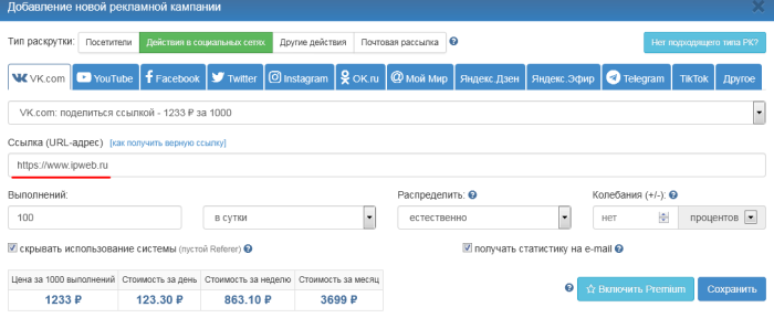 Зайдите в свой аккаунт на IPweb. В меню слева кликните «Продвижение» — «Мои кампании» — «Добавить рекламную кампанию» — «Действия в социальных сетях» — «VK» — «VK.com: поделиться ссылкой».