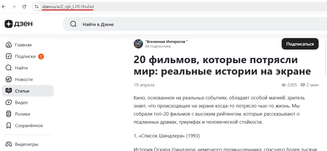 Для создания этой рекламной кампании вам необходима ссылка на выбранную статью или на канал Дзен. Скопируйте её в адресной строке браузера.