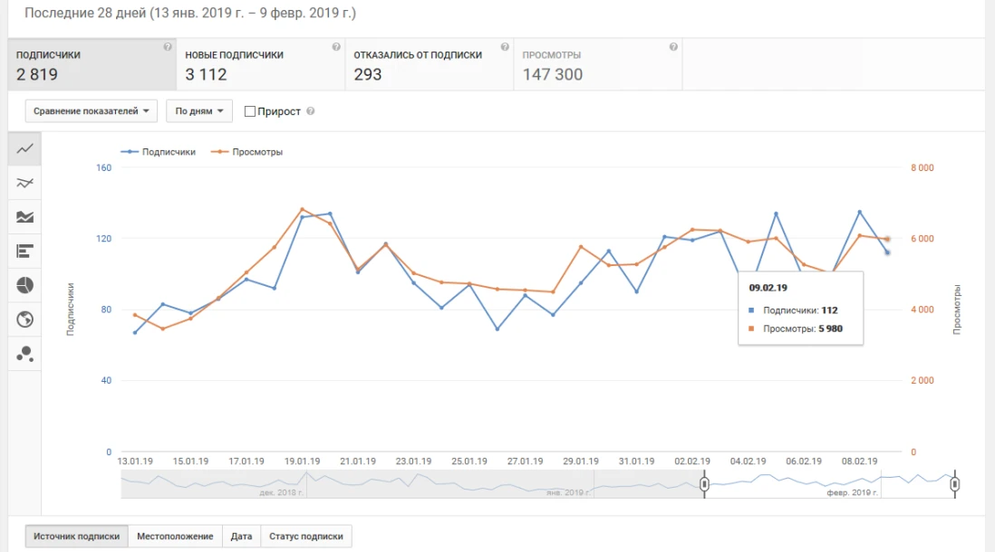 Скорость развития канала (прирост просмотров и подписчиков канала за месяц и за год). Средний показатель – 10-15% от общего количества подписчиков в месяц для небольших каналов и 1-3% прироста для каналов от 1 млн. подписчиков.