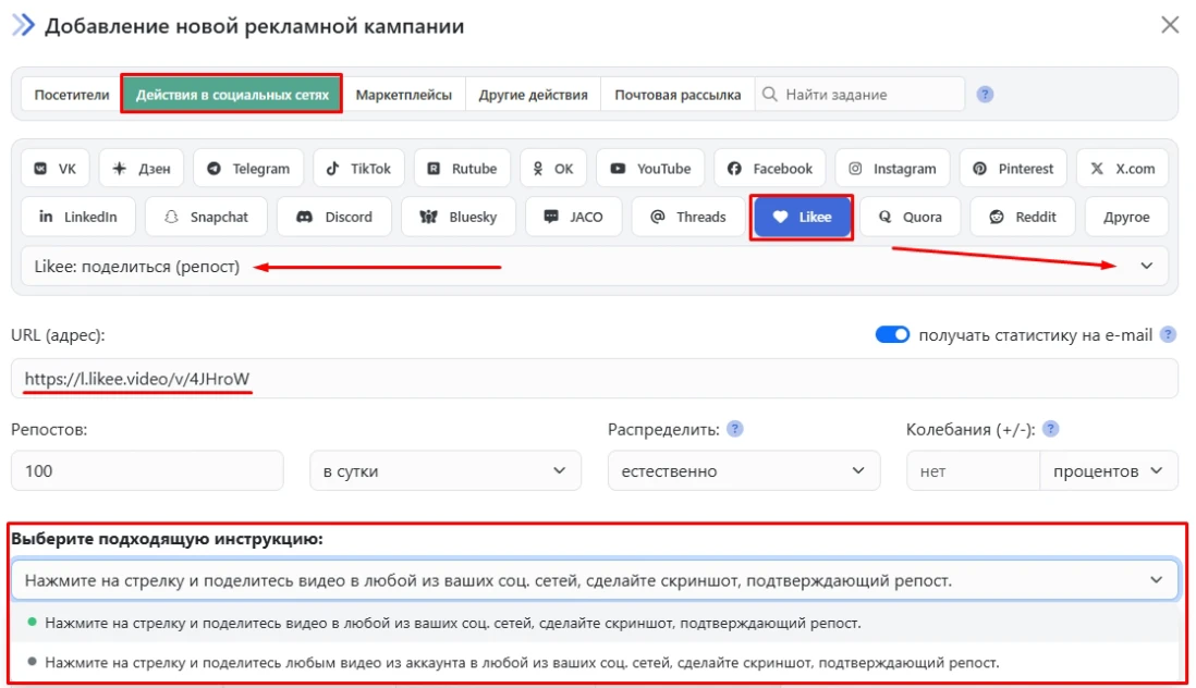 Введите ссылку на видео или аккаунт, количество репостов в нужный период, выберите подходящую инструкцию из выпадающего списка и нажмите кнопку «Сохранить». Кампания сразу отправится на модерацию и будет запущена после прохождения проверки.