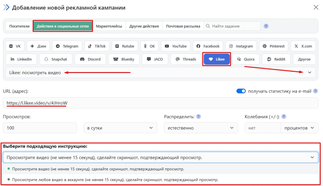 Введите ссылку на видео или аккаунт, количество просмотров в нужный период, выберите подходящую инструкцию из выпадающего списка и нажмите кнопку «Сохранить». Кампания сразу отправится на модерацию и будет запущена после прохождения проверки.