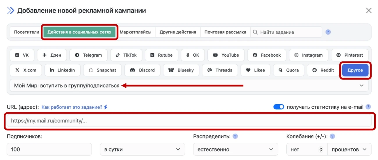 Зайдите в свой аккаунт на IPweb. В меню слева кликните «Продвижение» — «Мои кампании» — «Добавить рекламную кампанию» — «Действия в социальных сетях» — «Другое» — «Мой Мир: вступить в группу/подписаться».