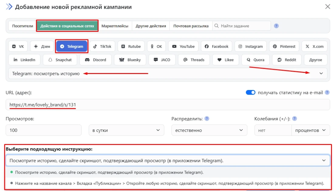 Введите ссылку на историю, количество просмотров в нужный период, выберите подходящую инструкцию из выпадающего списка и нажмите кнопку «Сохранить». Кампания сразу отправится на модерацию и будет запущена после прохождения проверки.