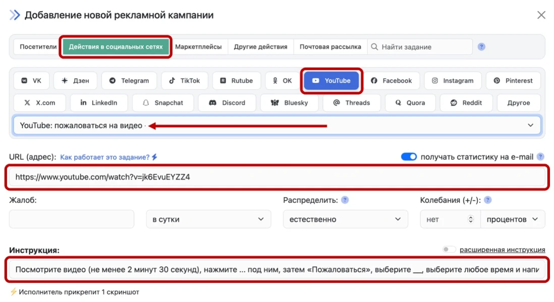 Введите ссылку на страницу ресурса, заполните инструкцию к выполнению задания и количество жалоб в сутки.