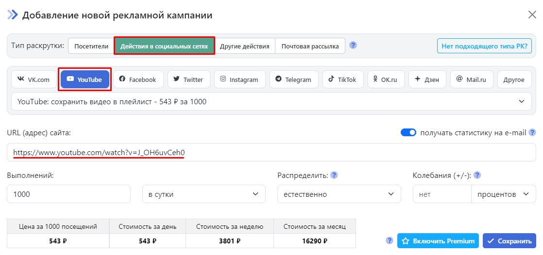 Введите ссылку на страницу видео (или ваш канал), количество сохранений в плейлист в нужный период, выберете подходящую инструкцию и нажмите кнопку «Сохранить».