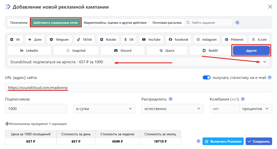 Введите ссылку на профиль артиста в Soundcloud, количество подписчиков в нужный период и нажмите кнопку «Сохранить». Кампания сразу отправится на модерацию и будет запущена после прохождения проверки.
