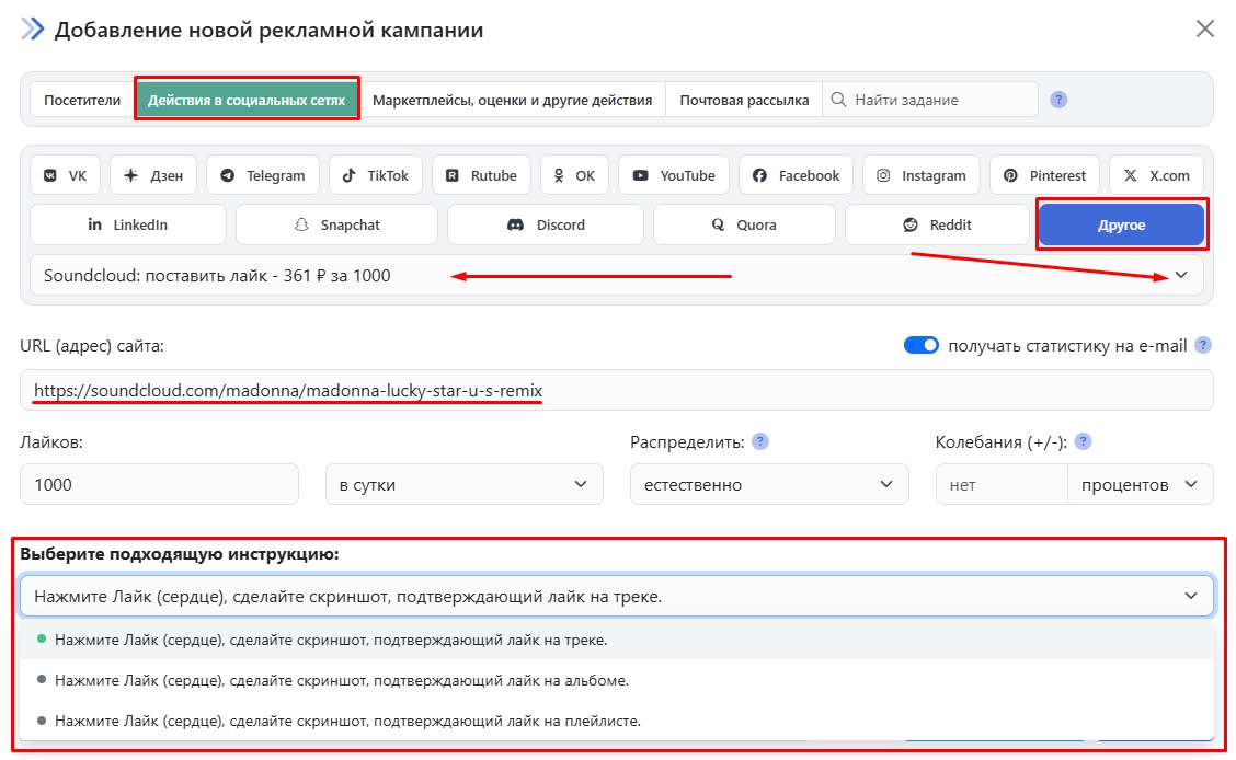 В рамках этой рекламной кампании можно заказать лайки на трек, альбом и плейлист на популярной музыкальной платформе Soundcloud. Для каждого исполнения выделена своя инструкция, которую нужно выбрать в зависимости от необходимых действий.
