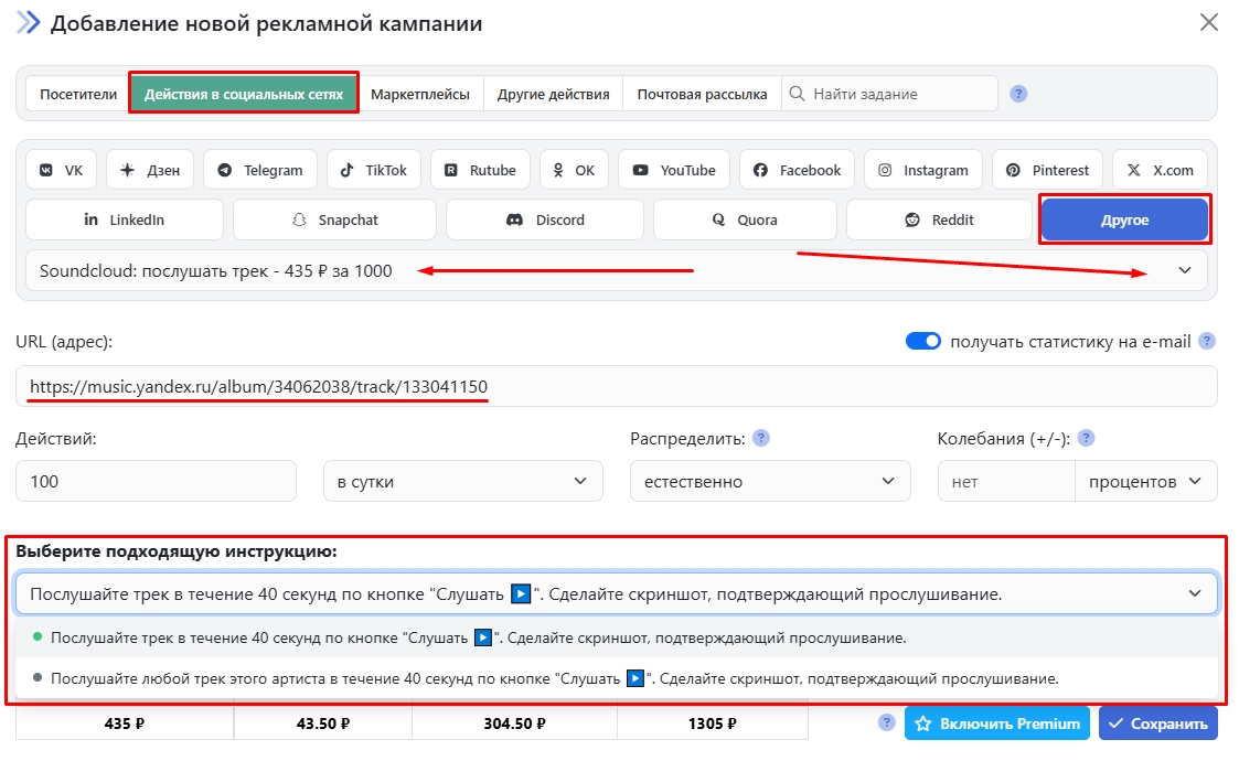 Введите ссылку на трек или все треки, количество прослушиваний в нужный период времени, выберите подходящую инструкцию из выпадающего списка и нажмите кнопку «Сохранить». Кампания сразу отправится на модерацию и будет запущена после прохождения проверки.