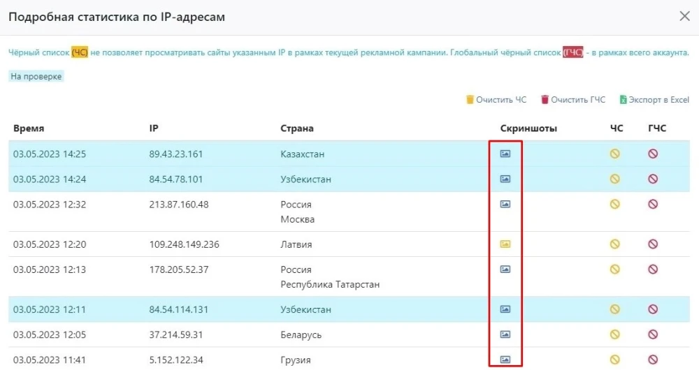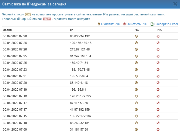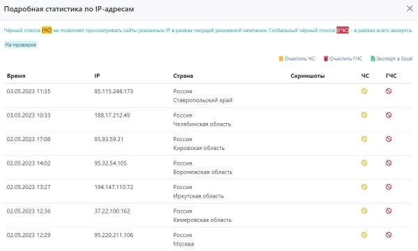 Кроме этого в этом окне вы можете добавить отдельный ip в черный список, очистить весь черный список и экспортировать данные в Excel.