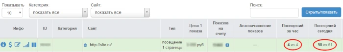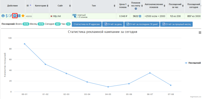 Основная статистика (количество посещений/действий за текущий день и текущий час) по рекламным кампаниям обозначена в общей таблице на странице "Список продвигаемых кампаний".