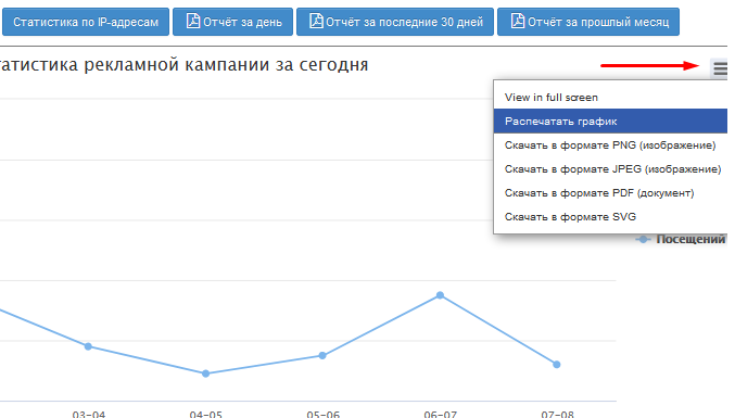 В общем окне статистики можете выгрузить данные за день, за последние 30 дней, за прошлый месяц в формате pdf. Также доступно скачивание графика статистики в виде изображения и распечатка графика на принтере.