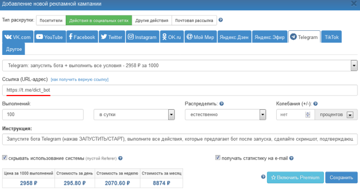 Введите ссылку на бота в Telegram, количество выполнений в сутки и измените при необходимости инструкцию.