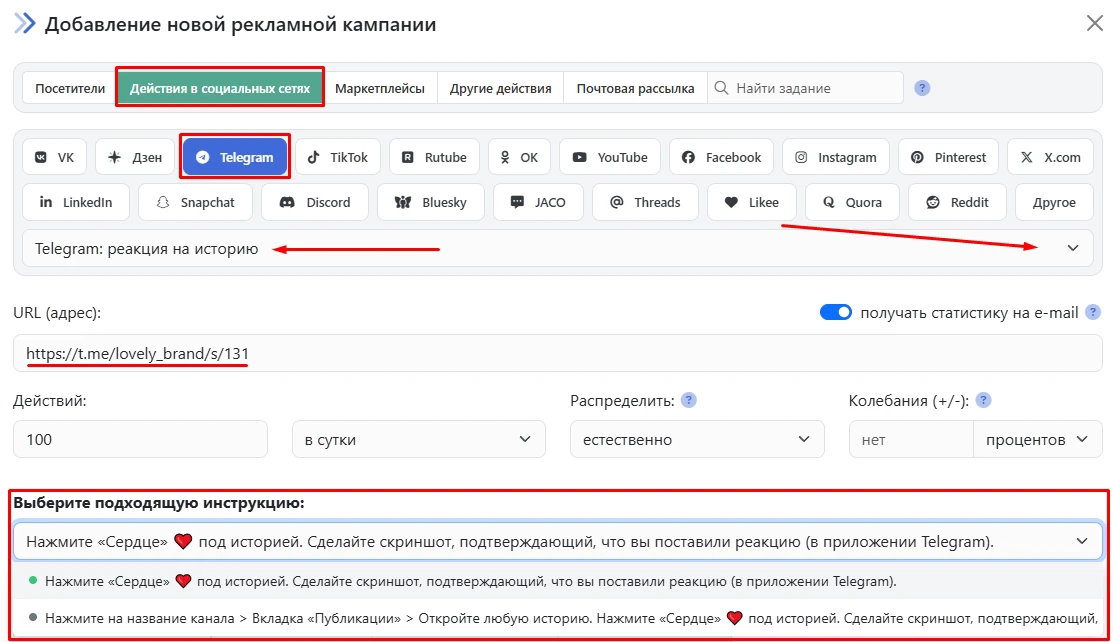 Введите ссылку на историю, количество реакций в нужный период, выберите подходящую инструкцию из выпадающего списка и нажмите кнопку «Сохранить». Кампания сразу отправится на модерацию и будет запущена после прохождения проверки.