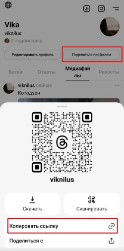 Для того чтобы создать рекламную кампанию, скопируйте ссылку на ваш профиль Threads в приложении через кнопку «Поделиться профилем».