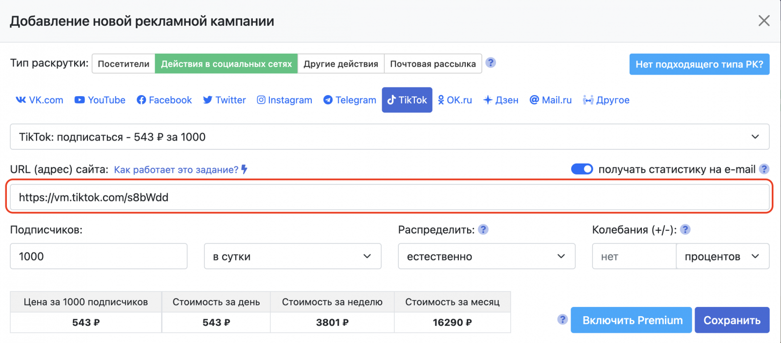 Введите ссылку на видео в TikTok и количество подписчиков в сутки.