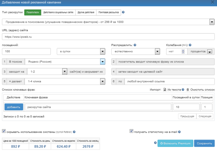 В отличии от кампании «Посетители из поисковых систем», пользователи будут заходить на любые сайты из поисковой выдачи (можно выбрать от 1 до 4) и сразу закрывать их. В конце — переходить на сайт рекламодателя. На сайте рекламодателя пользователь делает до 4 кликов по любым внутренним ссылкам.
