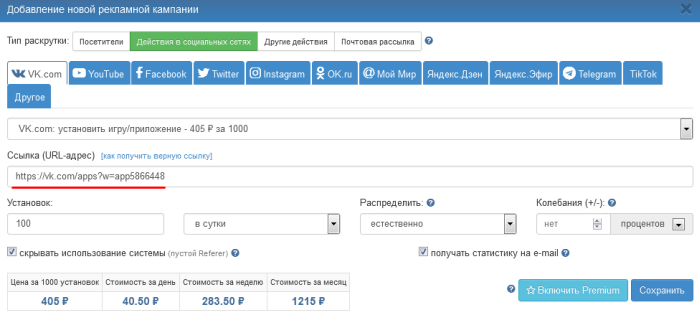 Введите ссылку на игру или приложение Вконтакте и количество установок в сутки.