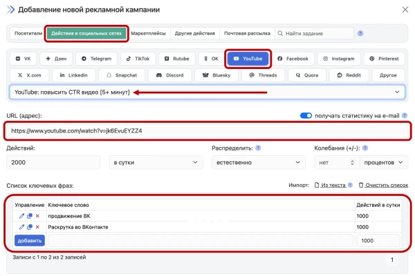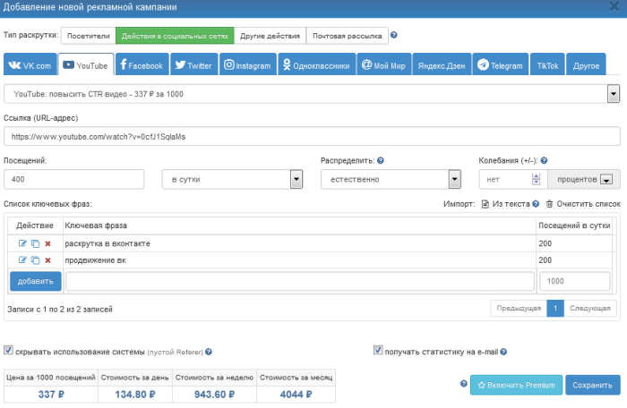 Укажите ссылку на видеоролик, ключевые слова, количество посетителей и нажмите кнопку «Сохранить».